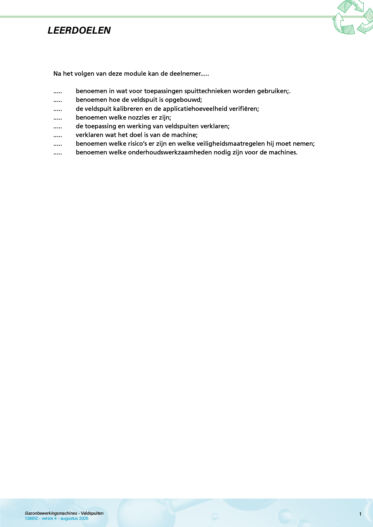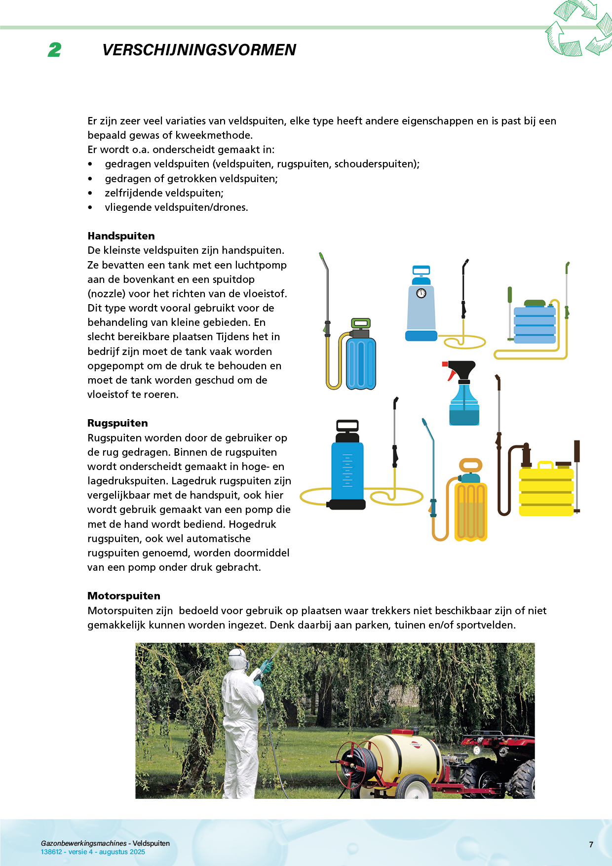 In het tweede hoofdstuk maak je kennis met de verschillende typen veldspuiten en wanneer je welk type moet inzetten. Ook wordt verteld aan welke voorwaarden je moet voldoen om met een veldspuit te mogen werken.