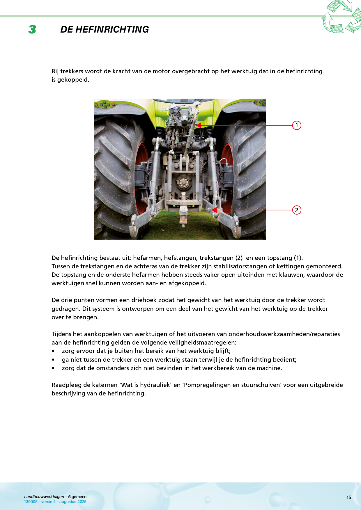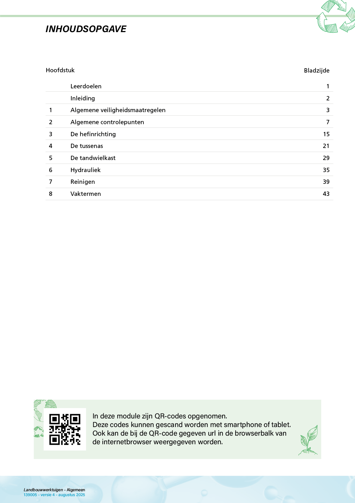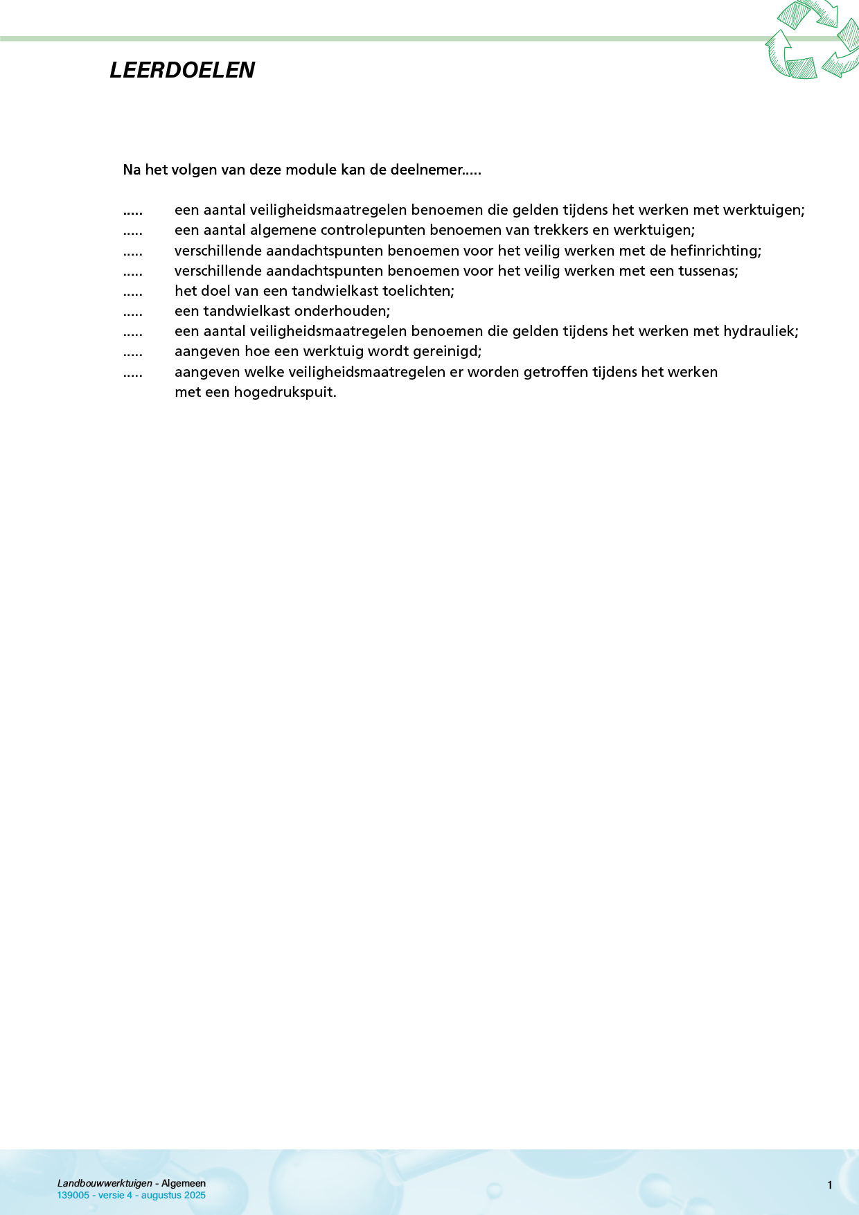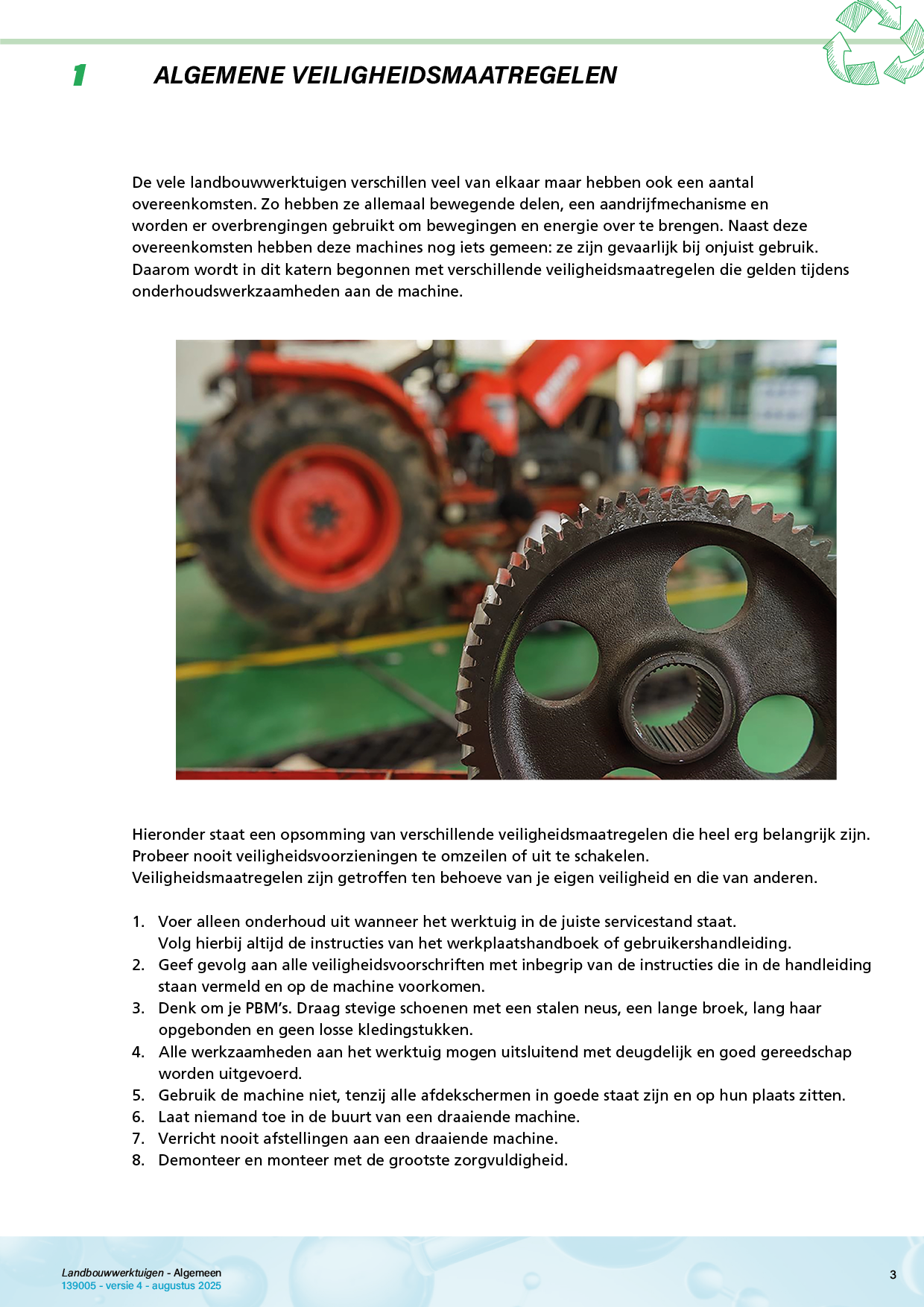 De specifieke werking en onderhoudspunten van deze machines zijn in deze katernen beschreven. Dit katern bestaat uit algemene veiligheidsmaatregelen en onderhoudswerkzaamheden aan landbouwwerktuigen en geldt als aanvulling op de specifieke katernen.