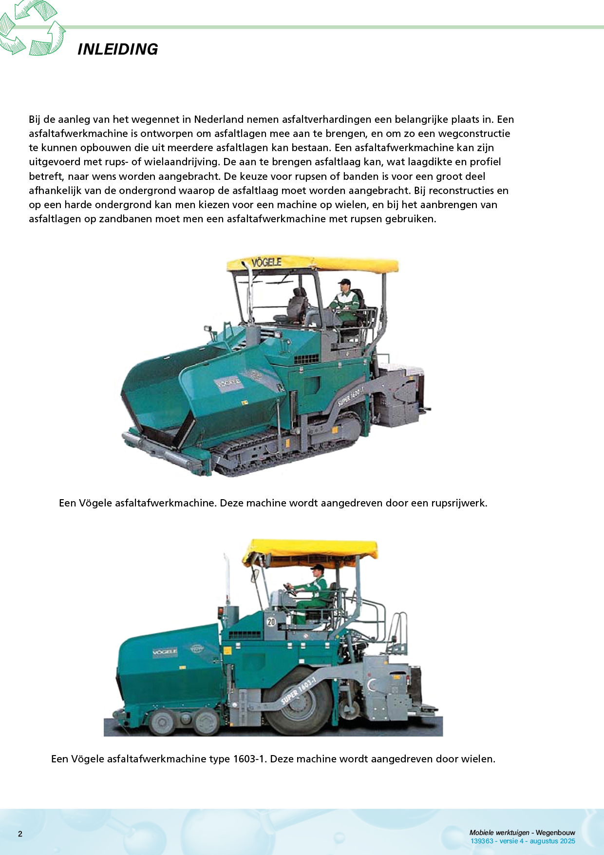 Een asfaltafwerkmachine kan zijn uitgevoerd met rups- of wielaandrijving. De aan te brengen asfaltlaag kan, wat laagdikte en profiel betreft, naar wens worden aangebracht.