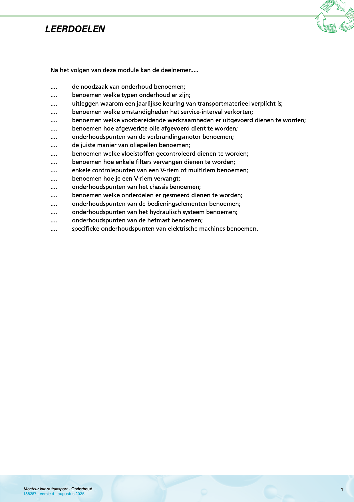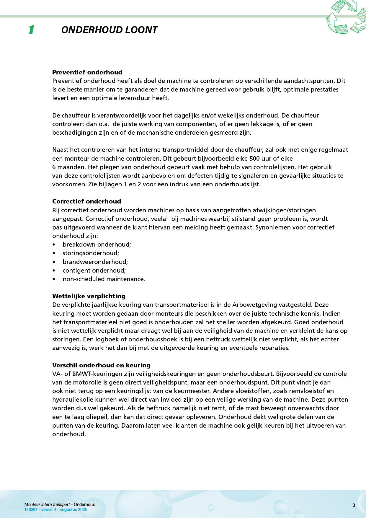 Onderhoud, vooral preventief onderhoud, aan interne transportmiddelen is van groot belang. Het zorgt niet alleen voor optimale productiviteit van de machine maar draagt ook bij aan de veiligheid. De kosten voor preventief onderhoud worden daarnaast vaak terugverdiend in de vorm van een hogere inruilprijs.