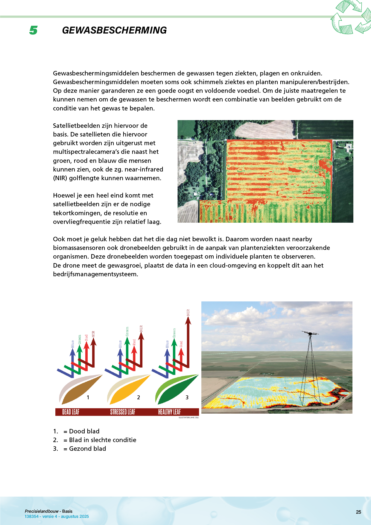 Een boer kan tegenwoordig vanuit zijn trekker via de satelliet exact bepalen waar hij zich op zijn akker bevindt en hoeveel hij daar oogst. De satellieten die hiervoor gebruikt worden zijn uitgerust met multispectralecamera’s die naast het groen, rood en blauw die mensen kunnen zien, ook de zogenoemde near-infrared (NIR) golflengte kunnen waarnemen.