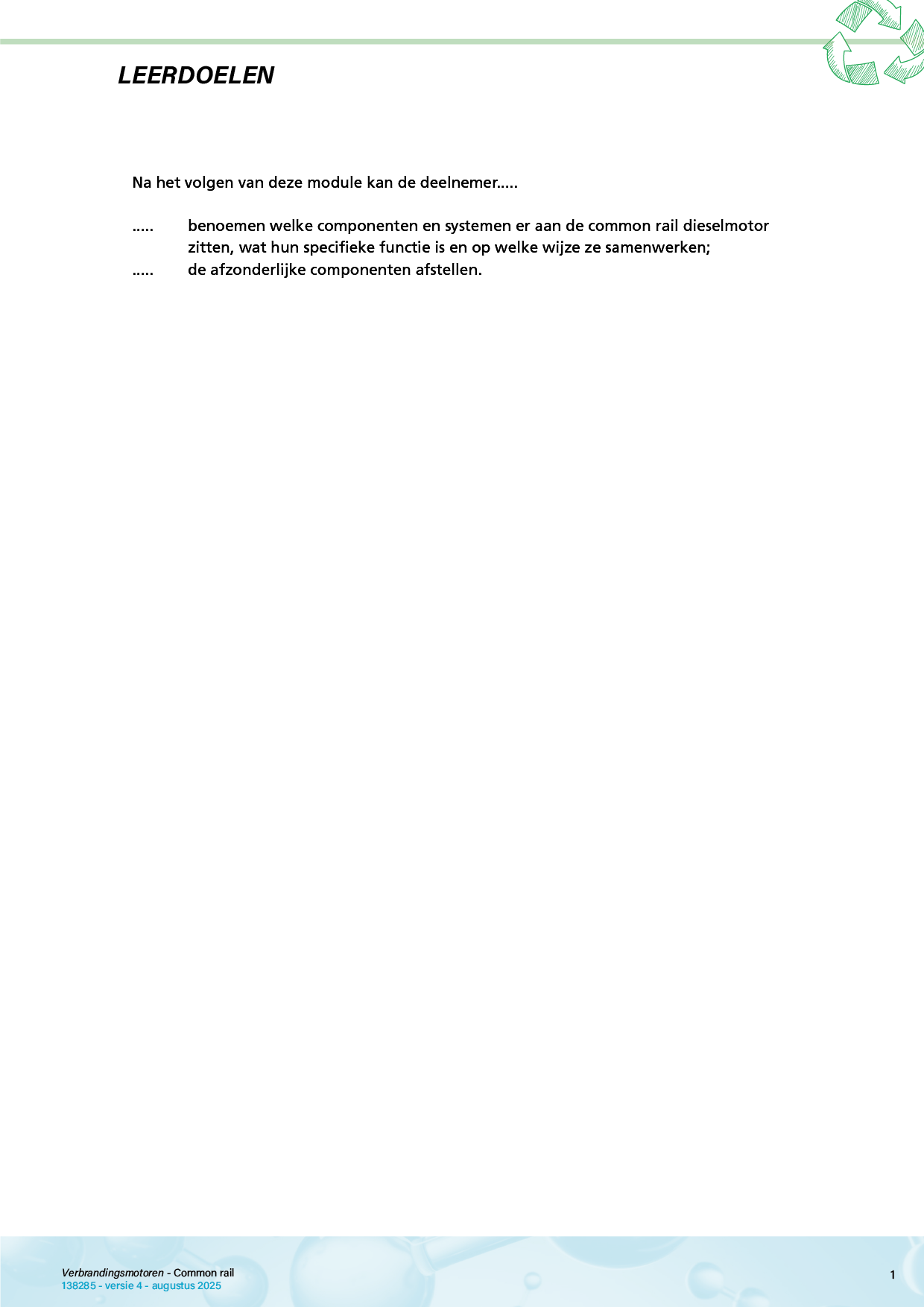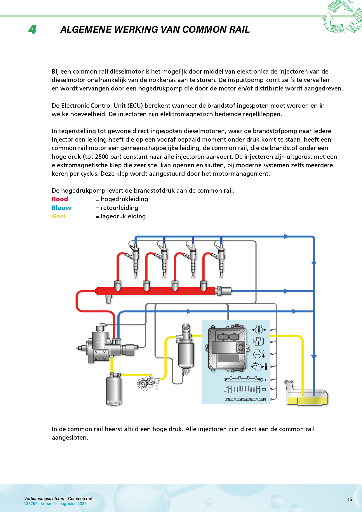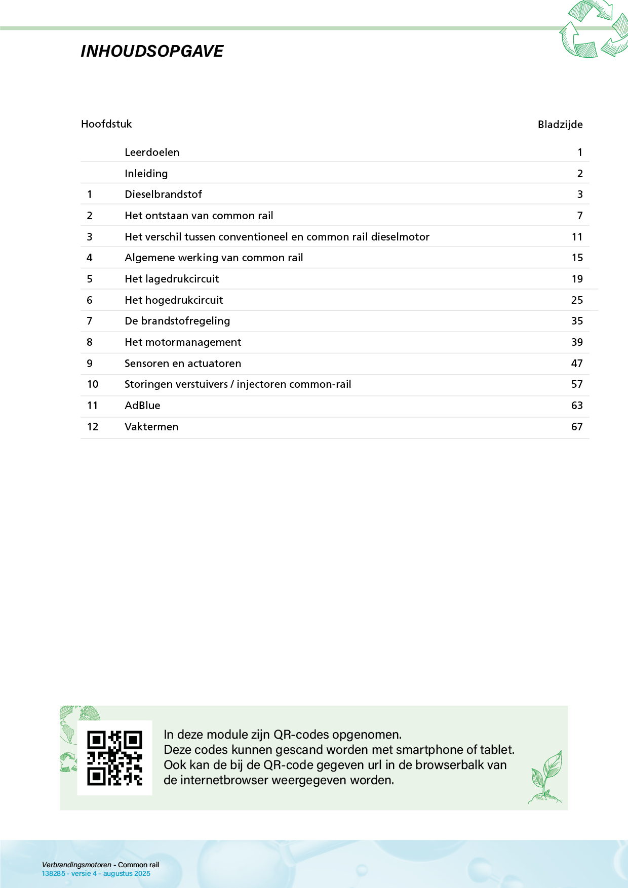 In dit katern gaan we in op enkele eigenschappen van dieselbrandstof en wordt het verschil tussen een common rail- en een conventionele dieselmotor toegelicht. Daarnaast wordt beschreven welke componenten en systemen er aan de common rail dieselmotor zitten, wat hun specifieke functie is en op welke wijze ze samenwerken. Tenslotte wordt ingegaan op het motormanagement en worden de belangrijkste sensoren en actuatoren uitgelicht.